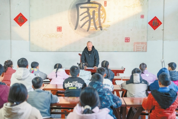 遵循上甘棠村春节古俗,退休教师周世旺在家学讲堂里给孩子们讲述“忠孝廉节”的家风故事。