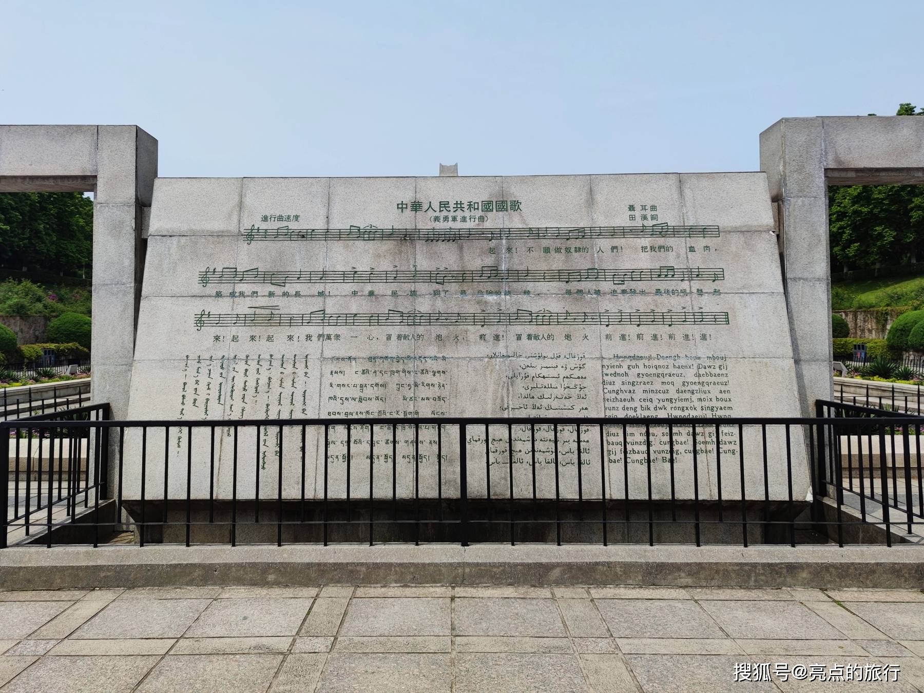 纪念碑前方为纪念广场,建有倒影池、纪念桥等。倒影池两端用花岗岩砌造了两面形似红旗的壁面,壁面上分别以汉、蒙、回、藏、维五种文字镌刻着《国际歌》和《中华人民共和国国歌》的歌词。