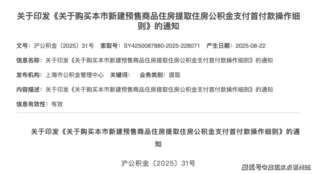对于购房者最为关心的公积金提取支付首付款问题,上海市公积金管理中心也出台了《购买本市新建预售商品住房提取住房公积金支付首付款操作细则》(2025年8月26日起施行).