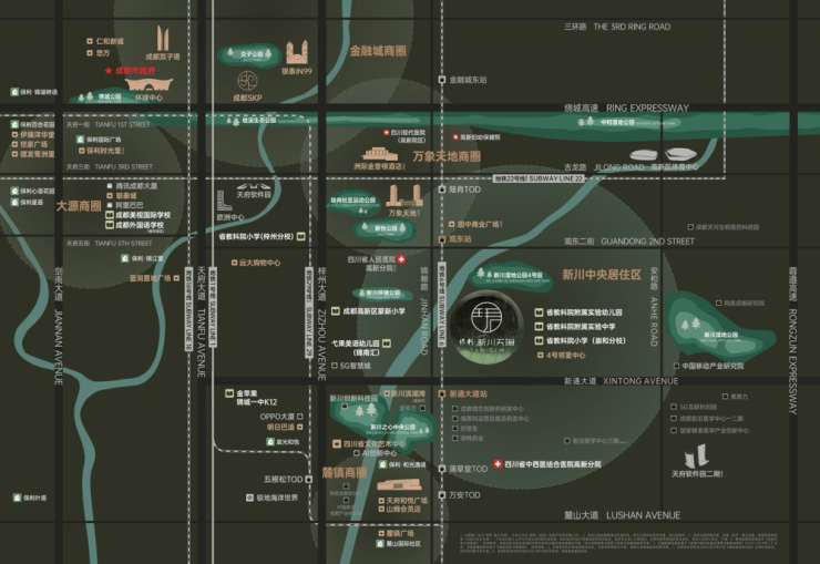 商业:约3KM内新川潮奢生活圈:西南首个万象天地(建设中)、文艺潮流MALL明日巴适、蓝润置地广场、远大购物中心等,畅享24H生活场景;约7KM内金融城商圈、环球商圈:银泰IN99、悠方购物中心、仁和新城购物中心、环球中心、SKP等,万象缤纷生活。