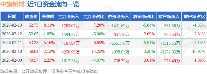 证券之星消息,截至2026年2月13日收盘,中旗新材(001212)报收于52.73元,上涨0.11%,换手率2.65%,成交量4.6万手,成交额2.45亿元。